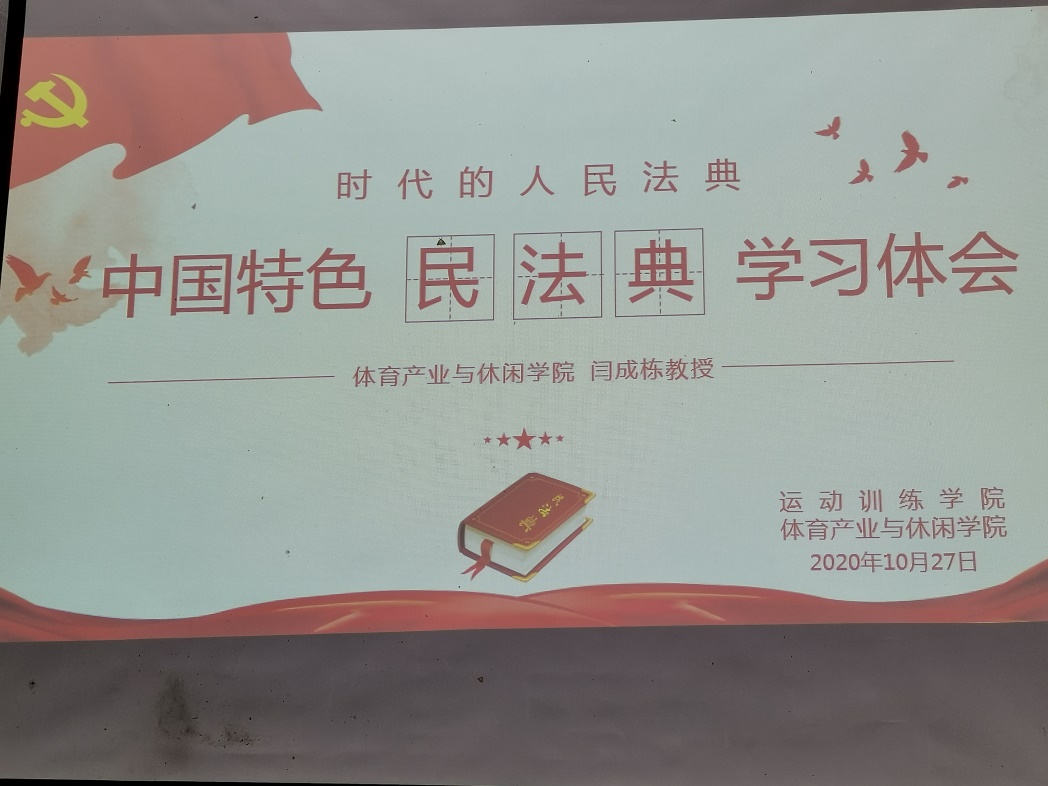 为认真贯彻实施和学习《民法典》,提升学院党员领导干部知法懂法的水平,10月27日下午,运动训练学院组织全体总支委员、支部委员、科级干部参加由体育产业与休闲学院主办的《民法典》学习培训。本次培训由体育产业与休闲学院总支书记王进主持,法理学博士后闫成栋教授主讲。