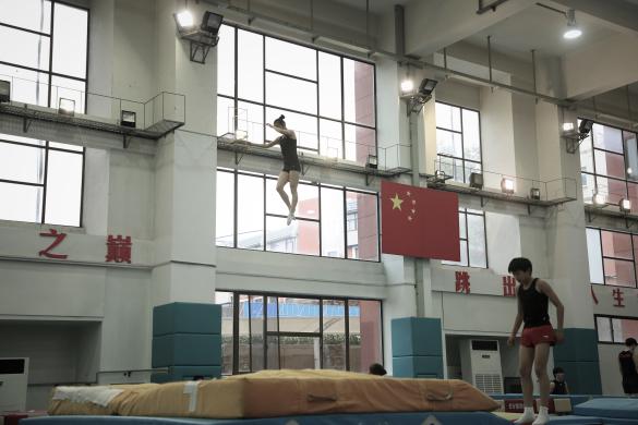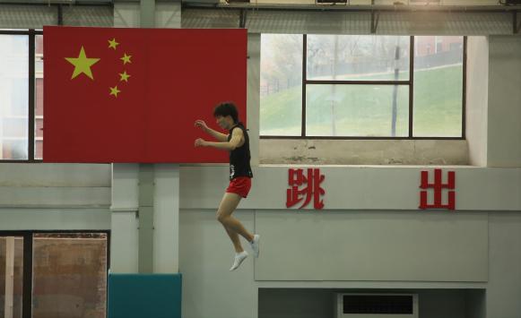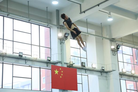 进入馆内,墙上“蹦上世界之巅,跳出人生华彩”几个大字映入眼帘,它每天激励着运动员努力训练,突破自己。仔细观察,每一位运动员都是专心致志投入到训练中,一次次蹦向高空、翻转、回旋,丝毫没有被进入拍摄的同学们所打扰,相信在未来的日子里,会有更多像张阔一样优秀的蹦床运动员从36365走向世界之巅。