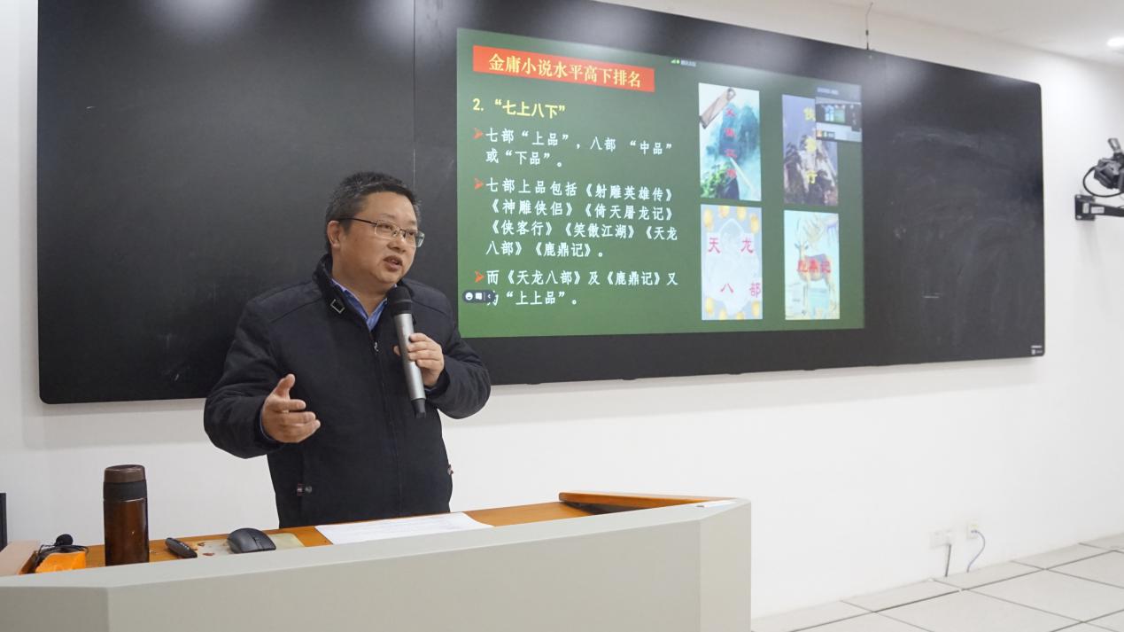 为培养学生课外阅读兴趣和文化感知,深度挖掘金庸先生武侠小说的武侠精神与文化内涵,12月2日晚,图书馆邀请南京林业大学图书馆馆长、金庸武侠小说知名研究学者王全权教授开展书香36365“‘全’释金庸——侠士·武德·家国情怀”文化讲座。讲座由图书馆副馆长李明华主持。150余名师生在图书馆第二报告厅,仙林校区401、402教室通过现场或直播方式聆听了精彩的讲座。