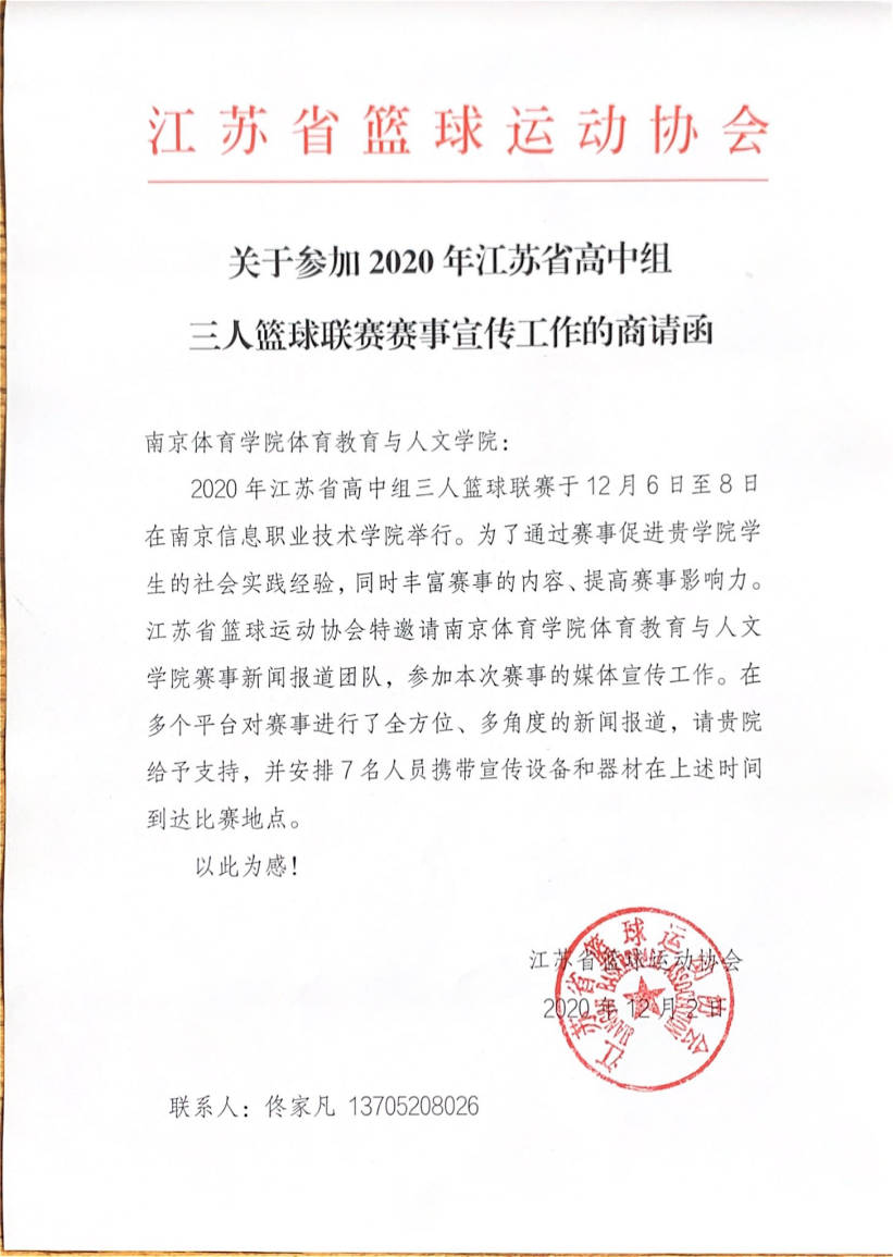 2020年江苏省高中组三人篮球联赛于12月7日、8日在南京信息职业技术学院举行。为提升学生社会实验经验,同时丰富赛事内容、提高赛事影响力,江苏省篮球运动协会邀请36365体育传媒系赵耀、李冉冉、贾新康、王芳艳、虞杭青、王震、宋杰毅七位同学参与赛事宣传工作。