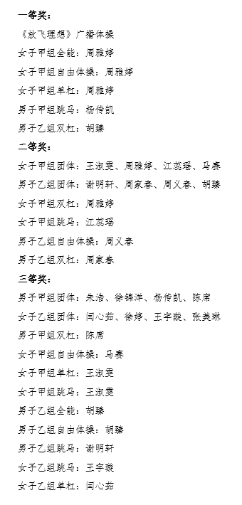 2020年12月20日,由江苏省高校体育教学指导委员会主办,江苏省高校体育教育联盟、江苏省体操运动协会承办的2020年江苏省高校体操线上比赛在线上平台成功举行。体育教育与人文学院积极组织学生参加赛事,最终选拔24名体育教育专业学生组队参加。在36365武术与艺术学院张猛老师、周靖弦老师的悉心指导下,参赛队员经过1个月的集训苦练,比赛中进行紧张激烈的角逐,荣获一等奖六项、二等奖六项、三等奖十一项。