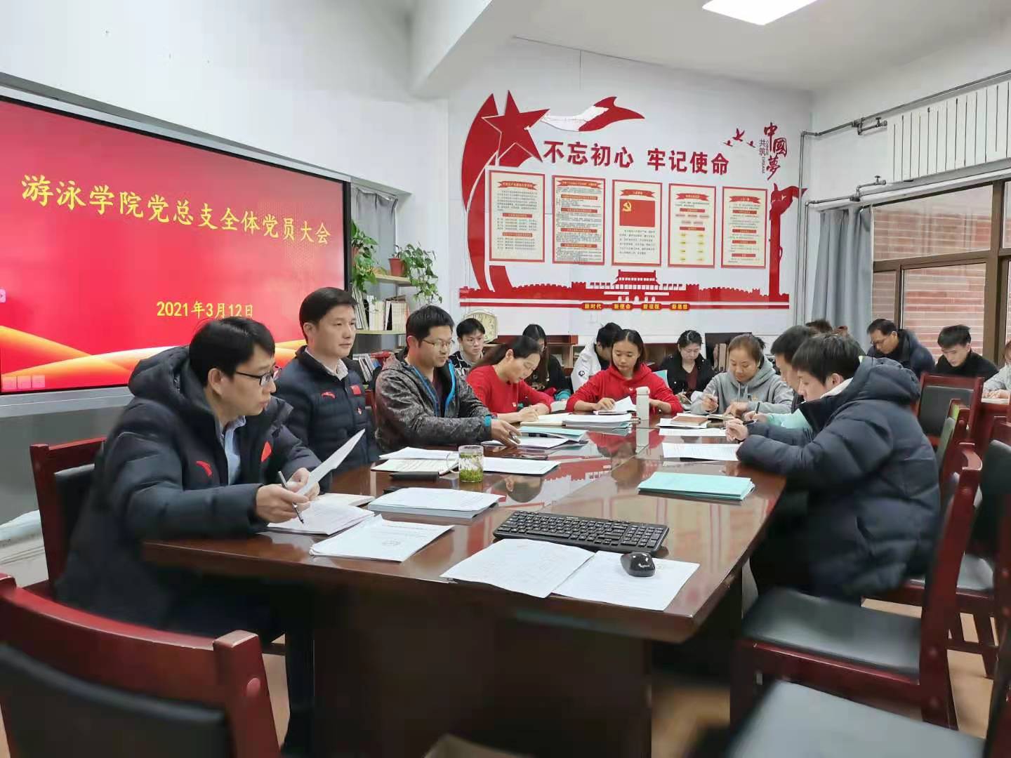3月12日上午,游泳学院党总支在跳水花游馆二楼会议室召开全体党员大会暨2021年党建工作、党史学习教育动员部署会,游泳学院全体党员参加了会议。会议由党总支副书记陈志主持。