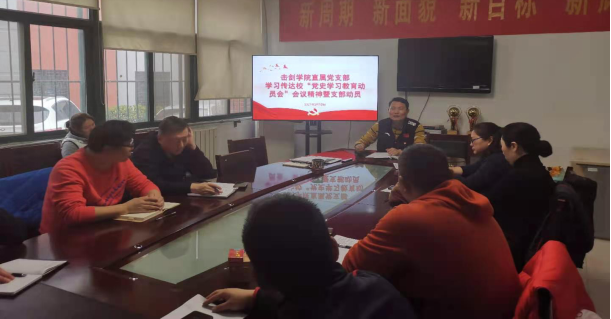 会上,沈朝阳书记先带领大家学习了习近平总书记在党史学习教育动员大会上的讲话精神,尤其将总书记强调的“我们党历来重视党史学习教育,注重用党的奋斗历程和伟大成就鼓舞斗志、明确方向,用党的光荣传统和优良作风坚定信念、凝聚力量,用党的实践创造和历史经验启迪智慧、砥砺品格。”进行了阐述,并引用新华社评论员的评论,帮助大家加深对总书记讲话的理解和吸收;随即将朱传耿书记、杨国庆校长在学校动员大会上的讲话精神和具体指示进行了传达;要求击剑学院全体党员干部和教练员借助学党史学习教育的机会,自觉运用习近平新时代中国特色社会主义思想武装头脑,指导管理、训练、服务保障实际,从小事做起,落小、落细、落实,推动训练备战工作上水平,提质量,增效益,出明星,拿冠军,切切实实为学校的发展作贡献。
