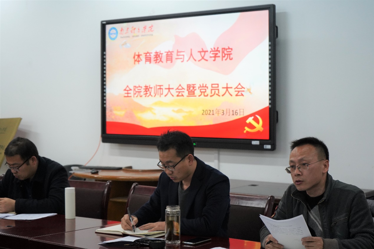 为深入学习贯彻习近平总书记在党史学习教育动员大会上的重要讲话精神和党中央决策部署,落实校党委党史学习教育动员会议精神。3月16日下午,体育教育与人文学院在教学办公楼115会议室召开全院教师大会暨党员党史学习教育动员大会。体育教育与人文学院副院长(主持工作)王凯、副院长李金宝、副院长叶强出席会议,体育教育与人文学院全体教师、党总支全体党员参加会议。会议由王凯主持。