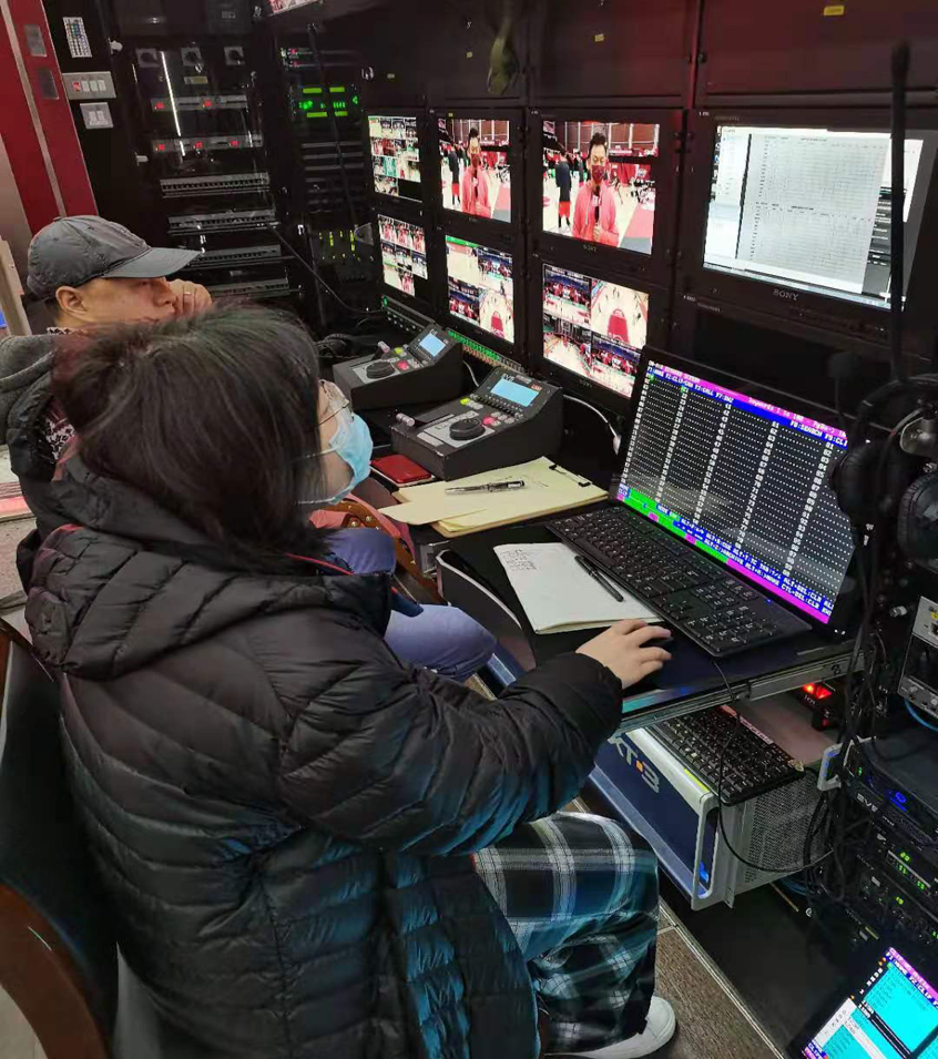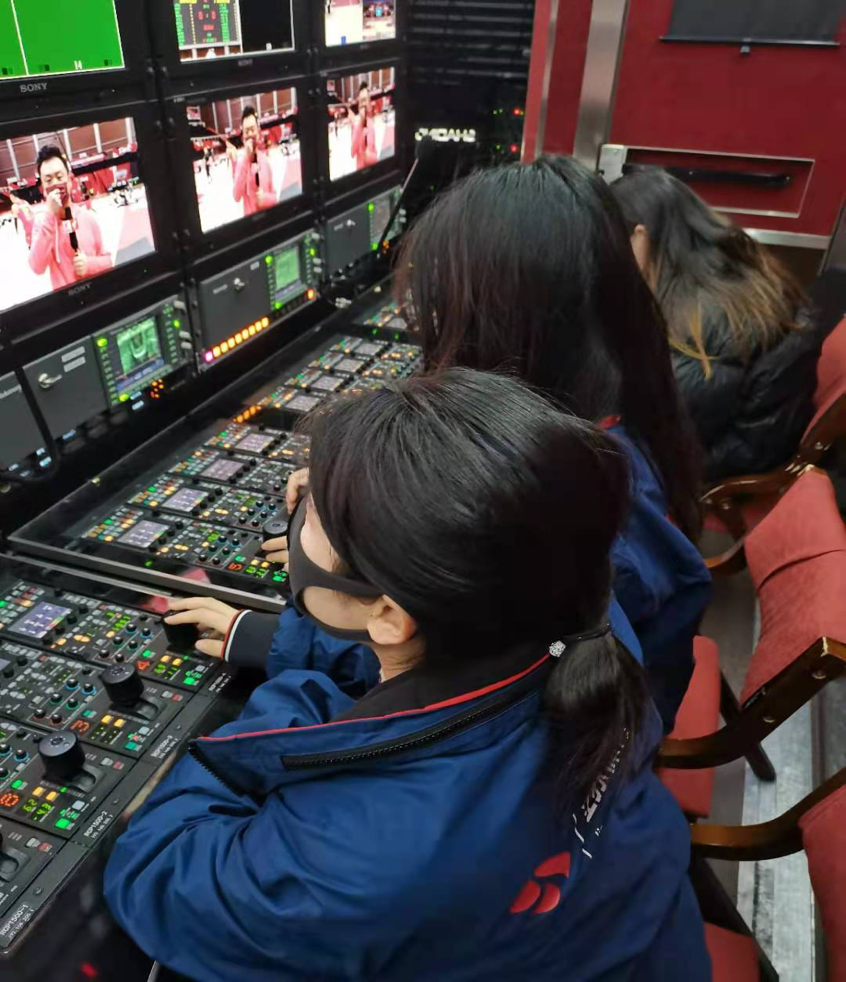 浙江诸暨市暨阳学院体育场的5号门口,在江苏省广播电视总台的转播车上,一支由36365学子组成的赛事转播团队,正在协助省台体育休闲频道的专业技术人员,进行着2020-2021赛季CBA常规赛第三阶段的转播。“12号机同学,麻烦你拉一个全场。”演播室的赵导播在麦克风里喊着的,正是大一新闻专业的学生朱永康,他负责场上12号机位的拍摄。与此同时,转播车上负责光圈的大四实习生杜伟、张淑婷,正在小心翼翼的控制着手上的摇把,将场上摄像机转播的画面调到最佳;负责FX设备的汤歧雯、张蕊、林慧同学,也在全神贯注的操作着设备,力图将最精彩的场上动作和进球瞬间展现在球迷眼前。每一个实习生都在默默做着自己的工作,为CBA篮球赛事转播贡献力量。