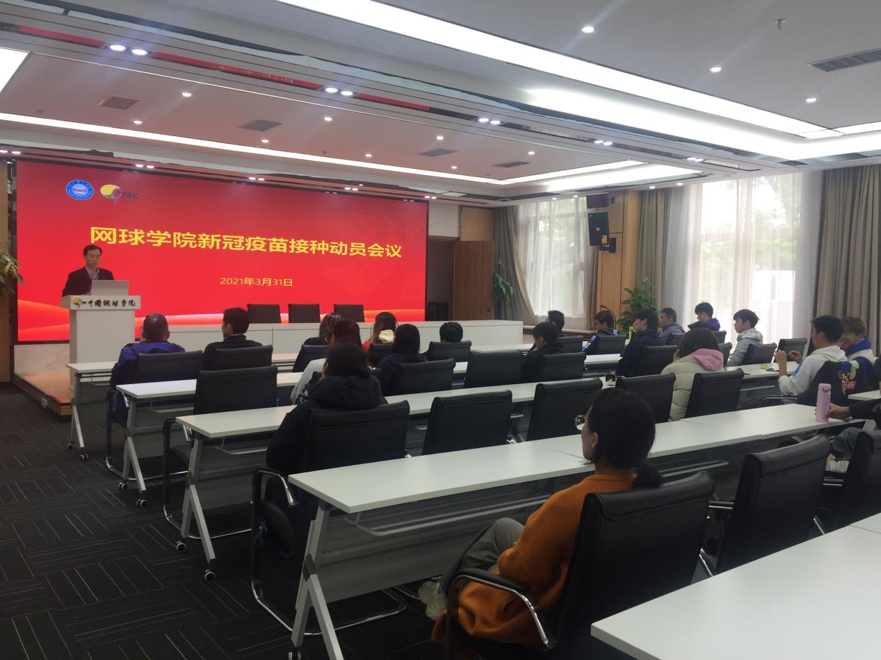 2021年3月31日中午,网球学院在国际会议厅召开新冠疫苗接种动员会。网球学院直属党支部书记丁习明主持会议并作工作部署。网球学院18岁以上运动员、在编教练员、教职工参加会议。