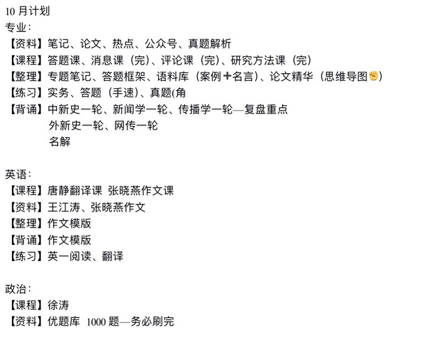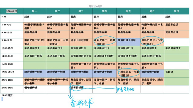 ①做好时间规划。曹敏一再强调规划的重要性,她会每天把计划写在小本子上,不停的根据状态调整。考研学习最忌讳的就是盲目的“一股脑”学习,“每当有情绪时,我都会把下面的计划拿出来捋一遍。”