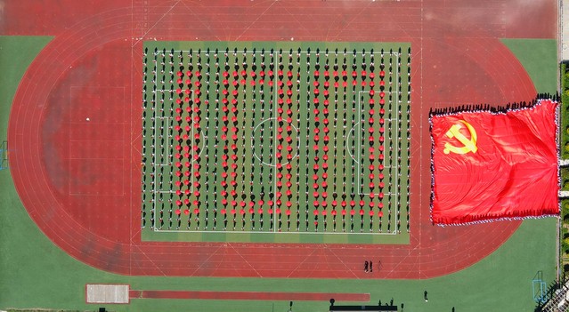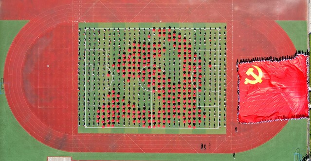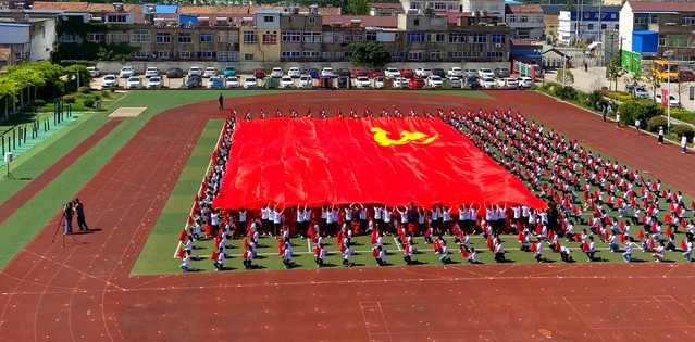近千名小学生和36365师生一起,大手拉小手共绣党旗。主席台上高校和小学代表手工绣党旗,台下操场上近千名小学生在技巧世界冠军赵杰老师的指导下,利用团体操队形变换出各式各样的图案,并拼出“中国、1921、2021、100”和党徽等图案,台上台下交相呼应共绣党旗,最后一面巨幅鲜红的党旗从学生们头顶飘过,象征着小学生们在党的关怀下茁壮成长。