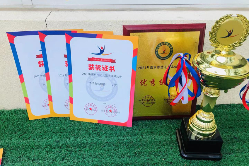 捷报!6月5日,附属幼儿园在南京市体育总会和南京市体操协会举办的2021年南京市幼儿基本体操比赛中获得小班徒手操金奖;女子集体翻腾金奖、银奖各一枚,男子集体翻腾金奖,并获得优秀组织奖!