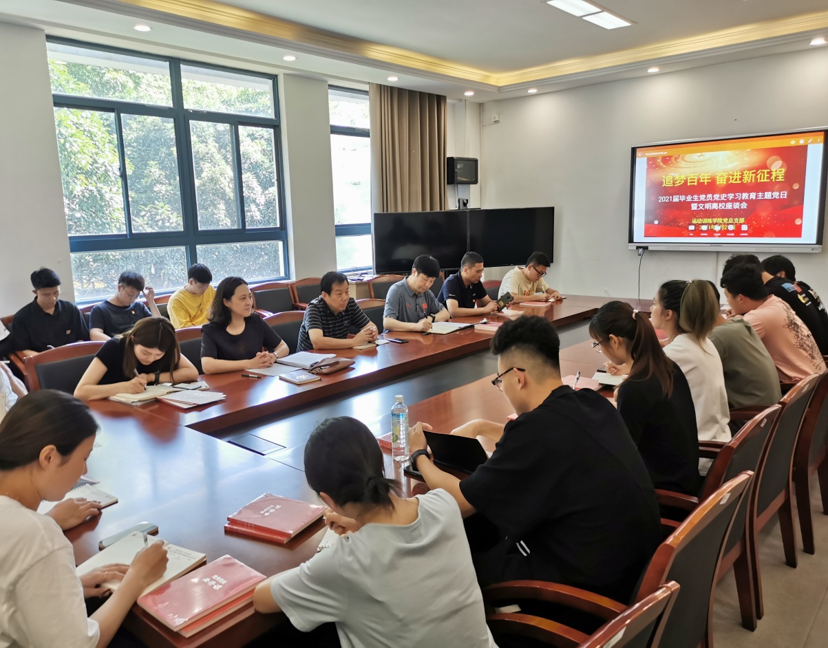 为加强对毕业生党员的党史学习教育,进一步强化毕业生党员的党员意识、提升党性修养,切实发挥毕业生党员在文明离校过程中的模范带头作用,6月21日下午,运动训练学院党总支部举行“追梦百年 奋进新征程”2021届毕业生党员党史学习教育主题党日暨文明离校座谈会。原运动系党总支书记、主任袁野教授担任主讲。学院党总支书记张亚军,副书记喻菊,总支组织委员、副院长张明,学院学工办副主任孙苏扬,以及2021届全体毕业生党员参加活动。活动由学院党总支副书记喻菊主持。