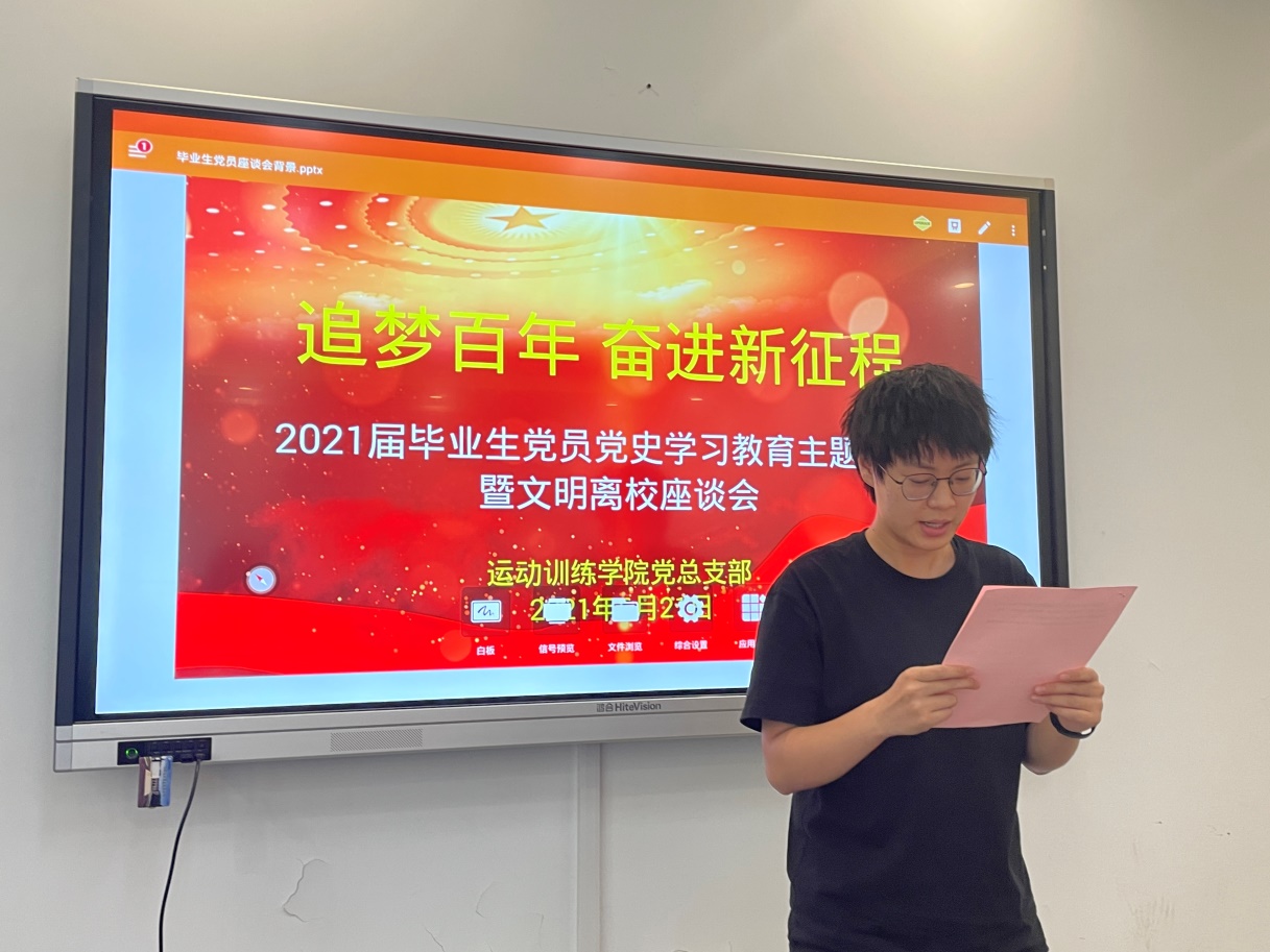 座谈会上,毕业生党员依次发言,畅谈了大学期间的收获和感动,向母校和老师表达了感激之情,同时就校园环境、教学设施、第二课堂、日常管理等多个方面提出意见和建议。孟婉莹同学作为毕业生党员代表宣读了《运动训练学院毕业生党员文明离校倡议书》,号召全体毕业生党员站好最后一班岗,积极配合学院做好各项工作,做到文明离校、安全离校。