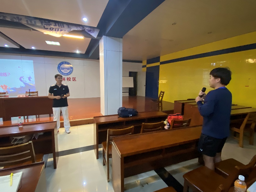随后,张晶晶老师从“什么是训练?”这个问题引入,从运动员选材、训练计划制定、训练的组织与管理、运动员行为习惯管理、训练的方法、体能训练等几个方面,结合自己的训练过程中的案例,对学生运动员训练的方法和经验进行了分享。