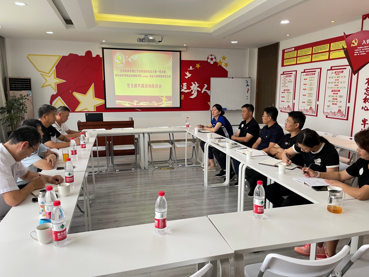 运动训练学院教师第四党支部与江苏省体育局江宁足球训练基地第一党支部召开了共建活动座谈会。双方支部书记分别介绍了各自支部建设的基本情况,与会所有党员同志均进行了单独发言,并就双方支部共建活动的长期性、系统性开展达成共识。座谈会在严肃、认真、活泼、友好的气氛中获得圆满成功。