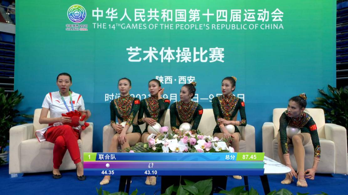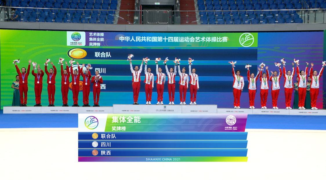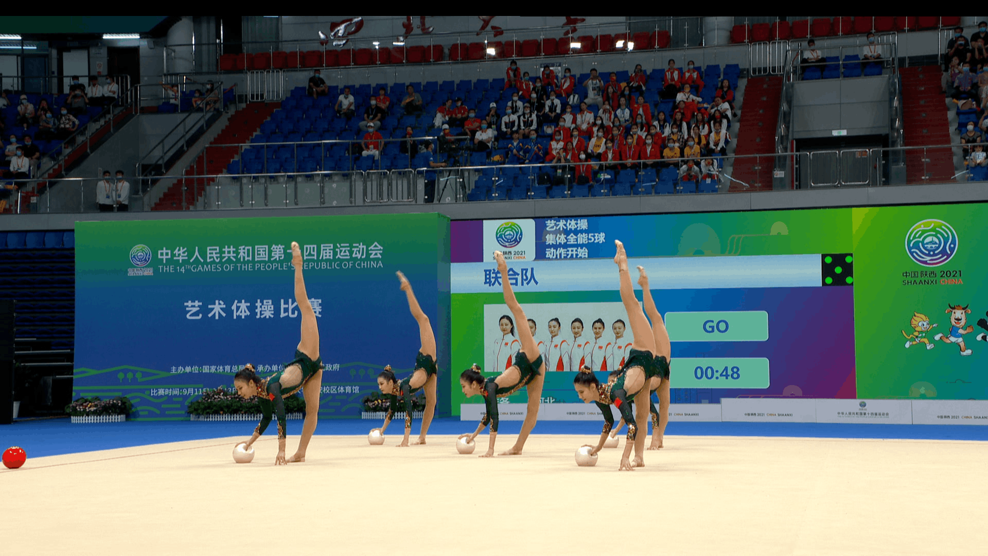 北京时间9月13日,中华人民共和国第十四届运动会艺术体操女子集体全能决赛在西北大学长安校区体育馆打响。来自7个不同地区的优秀女子集体团队角逐奖牌。郭崎琪、刘鑫、黄张嘉洋、许颜书和郝婷组成的队伍以87.45的佳绩夺冠。其中来自盐城的郝婷为江苏再添一金。