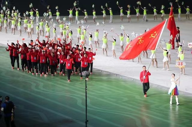 江苏省体育代表团第十个亮相开幕式。他们身着红色服装,手中挥舞着国旗,面带笑容、步伐坚定地走进全国人民的视野。江苏代表团旗手邱健,曾在2008年北京奥运会获得射击男子50米步枪三姿冠军,成为江苏省首位射击项目冠军。退役后的他在省方山体育训练基地担任步枪队领队,为省射击运动继续贡献力量。对于此次出任旗手,他表示,“知道我当旗手的消息时,特别激动,感谢江苏代表团的信任。”