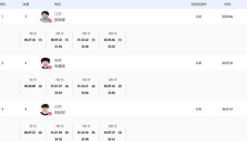 23日晚,女子 200 米蝶泳决赛精彩上演,位列第3道的张雨霏在场内外的呼声最高。前100米,张雨霏就已遥遥领先。后100米她快马加鞭,全力向金牌发起冲击。最终,张雨霏凭借出色发挥,游出了2分05秒84的好成绩,成功击败对手,卫冕冠军。福建选手朱嘉铭以2分07秒24的成绩位居第二,山西选手刘祉彤排名第三。