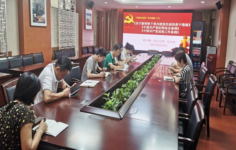 9月26日上午,机关第一党总支第一支部在行政办公楼301会议室开展了“纪律大宣讲”第三次学习活动。本次学习内容为《关于新形势下党内政治生活的若干准则》、《中国共产党纪律处分条例》和《中国共产党巡视工作条例》。会议由支部书记叶瑛主持,全体党员参加了学习。