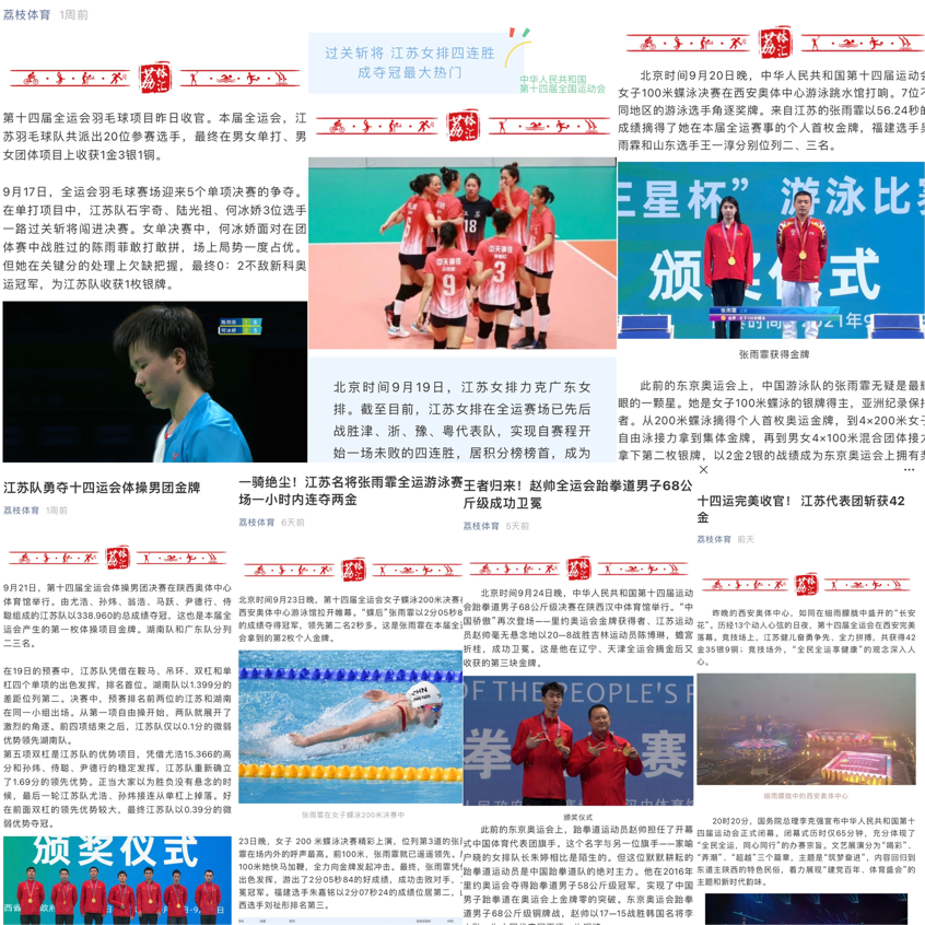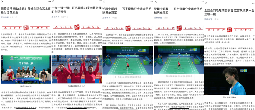 在西安广播电视中心工作的这大半个月,体育传媒系师生代表每天一早来就到工作岗位推出早晨第一场比赛,直至深夜最后一场比赛转播结束才披着星光返回酒店;江苏队在本届全运会中硕果累累,36365师生代表紧跟时事,每日都至少有一篇新闻稿产出,其中被荔枝体育收录的就有12篇;体育传媒系师生代表还利用空余时间剪辑全运会相关短视频并在社交平台发布。其中,一条关于江苏省女子蹦床团体的短视频在社交媒体颇有热度,浏览量已超10万。