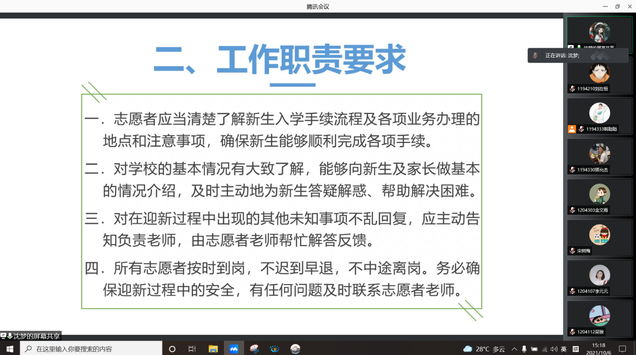 沈梦从自身形象及岗位职责两大方面,详细讲解了迎新志愿服务当天的具体要求。对迎新志愿服务涉及到的各个环节进行了细致安排,把工作任务安排到每一位志愿者身上,定岗定责,真正把细节落到实处。同时也要求全体志愿者在迎新工作的期间,也要做好个人防护工作,共同迎接新生的到来。
