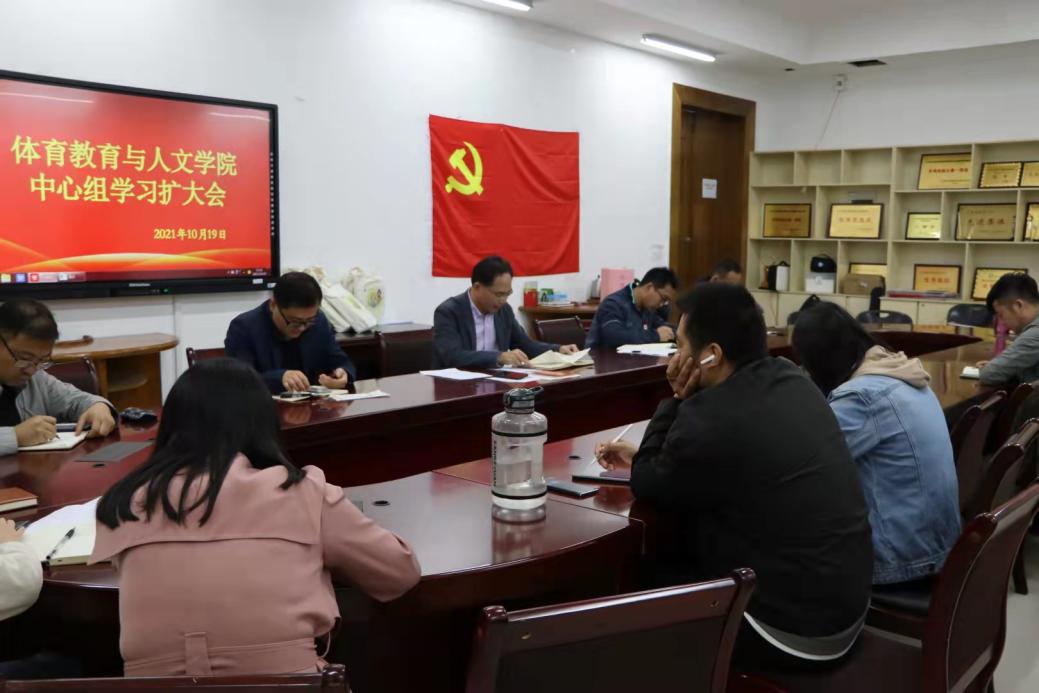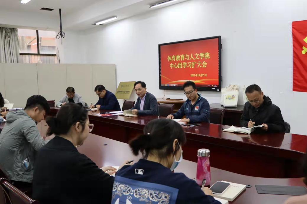 10月19日下午,体育教育与人文学院在教学办公楼115会议室召开中心组学习扩大会。体育教育与人文学院党总支书记邹国忠,副院长(主持工作)王凯,党总支副书记卢奎,副院长李金宝,副院长叶强,学院科级以上干部、各系部正副主任参加会议。会议由邹国忠书记主持。