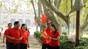 2019年9月30日,在祖国即将迎来70周年华诞之际,机关第一党总支第四党支部在位于国术场东侧的世界冠军之路上以现场教学的形式开展了一次特别的主题党日活动。校党委书记朱传耿到场指导党日活动并与支部党员亲切合影。支部党员骆晓娟和赵玉超在世界冠军之路与支部全体党员分享了他们的冠军成长之路、重温了他们的夺冠之路。