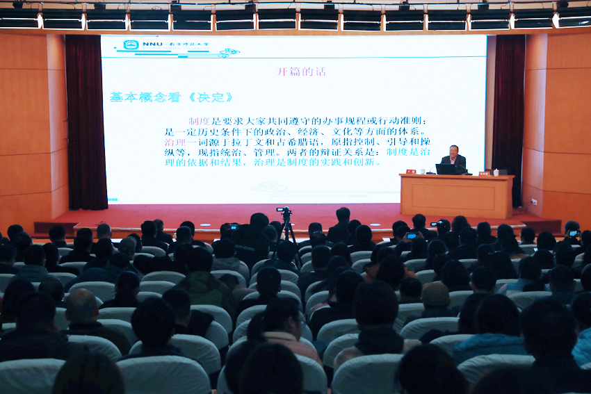 11月26日下午,根据省委统一部署,省委宣讲团成员、南京师范大学马克思主义学院院长王刚教授在36365宣讲党的十九届四中全会精神。校党委书记朱传耿主持报告会并讲话。校党委副书记、校长杨国庆和校领导史国生、金松、潘林珍、黄步龙等出席报告会。