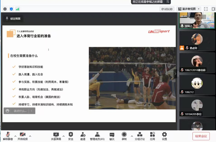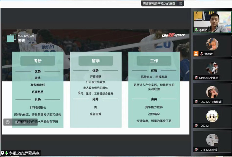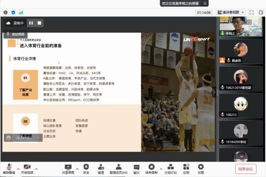 11月29日晚,唯体集团创始人李韬之先生应邀为体育产业与休闲学院的研究生与本科生开展题为《体育从业者的机遇与挑战》的主题分享会,本次分享会以在线会议形式进行,体育产业学院全体研究生和部分本科生共80余人次参与本次讲座。