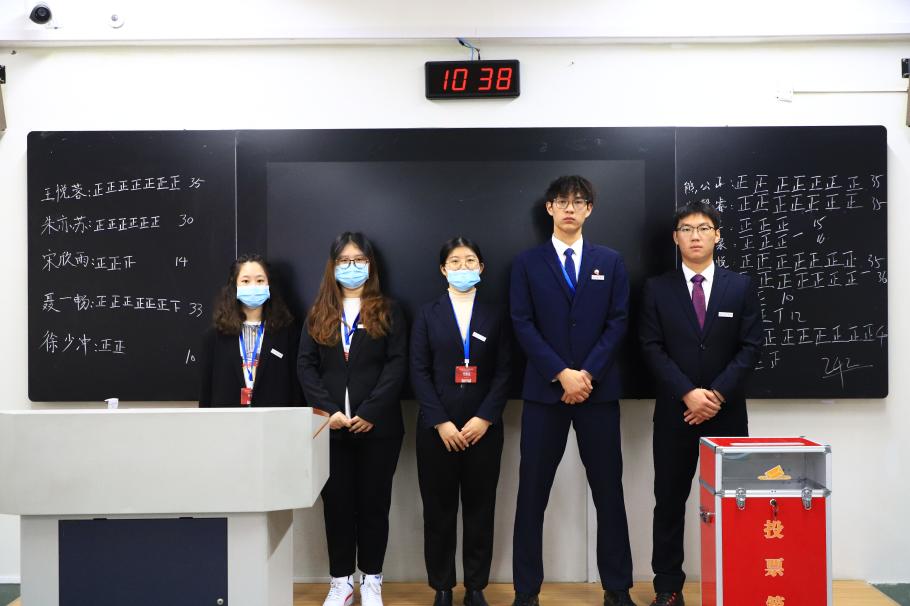 大会计票人员发放选票。学生代表现场填写选票并向投票箱投下自己庄严的一票。