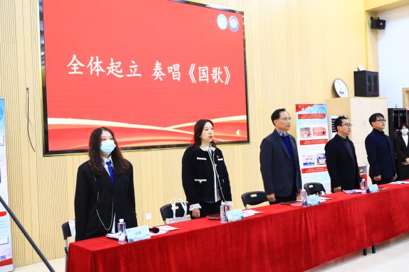 视频播放完毕后,主持人王悦蓉同学汇报代表人数和到场情况。到会人数符合大会章程,主持人宣布大会开幕,全体起立奏唱国歌。