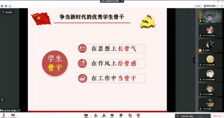俞特回望历史、立足现实向大家讲解了何为新时代下的优秀学生骨干。他向大家分享了新时代下的优秀学生干部应具备的三点重要品质:第一,在思想上长骨气,不要轻易向生活中的困难妥协,要有自我的信仰;第二,在作风上存骨感,要养成良好作风,作风端正,为人才能端正;第三,在工作中当骨干,以认真的态度对待工作,具有责任感、团队意识和集体意识,不马虎、不糊弄,高质量地把工作做好。此外,俞特他还针对大三同学的实际需求,介绍了自身在校学习、报考选调生等相关经验。