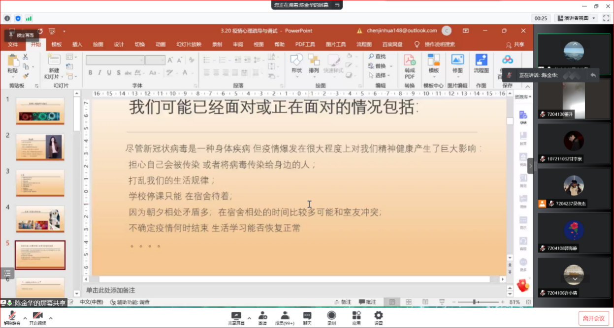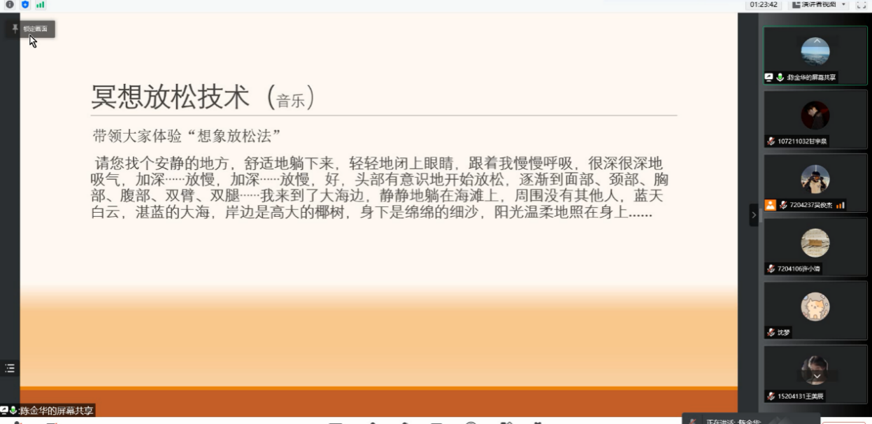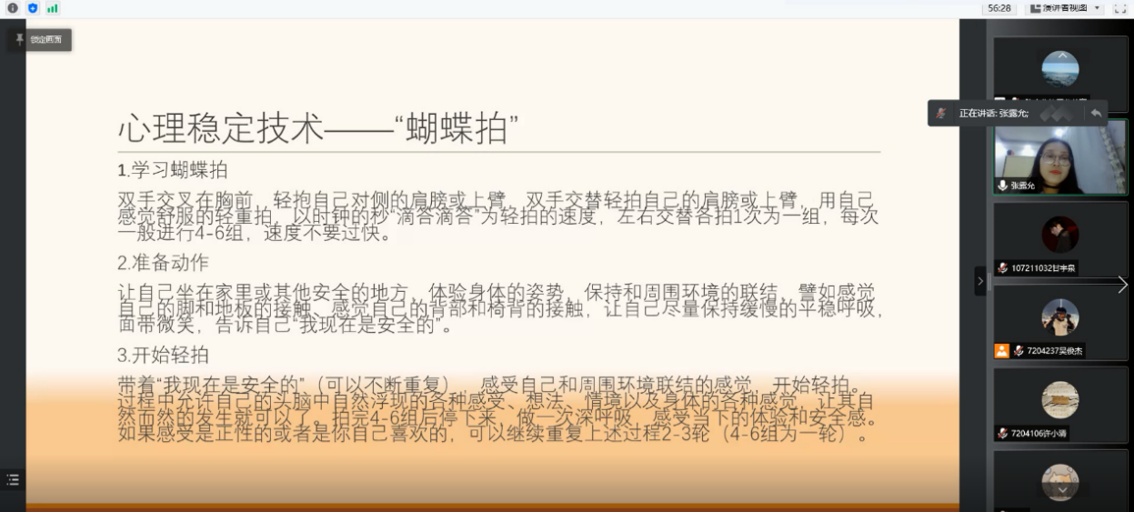 陈金华老师从疫情下的我们与社会现状引入讲座,详细地从各个层面、各个角度向大家描绘了如今我们可能面对或正在面对的情况,引起大家的共鸣。陈老师指出心理健康问题的出现会有神经衰弱、失眠浅睡、情绪低落、紧张焦虑等前兆,提醒大家密切关注自己的身心变化,及时疏导不良的心理状态,保持心理健康。陈金华老师与张露允老师从心理、动作、呼吸等方面教导大家稳定心理的技术,并就感受“蝴蝶拍”、冥想放松等项目做了演示。