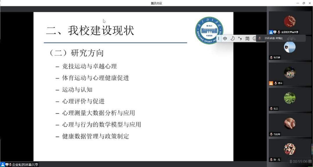 叶强指出,第一,心理学科的发展要立足学校特色,凝练突显36365心理学科已有优势,同时顺应学校学科建设快速发展态势,将劣势转化为优势;第二,可通过体卫融合、数字化信息技术融合等热点找准重点研究方向,找出差异,形成高地,例如疫情常态化背景下的竞技体育心理咨询和科技攻关的远程化、数字化、智能化;第三,建设比申报更重要,边建设边申报,以申报促建设,要持续努力,主动作为,协同发展。