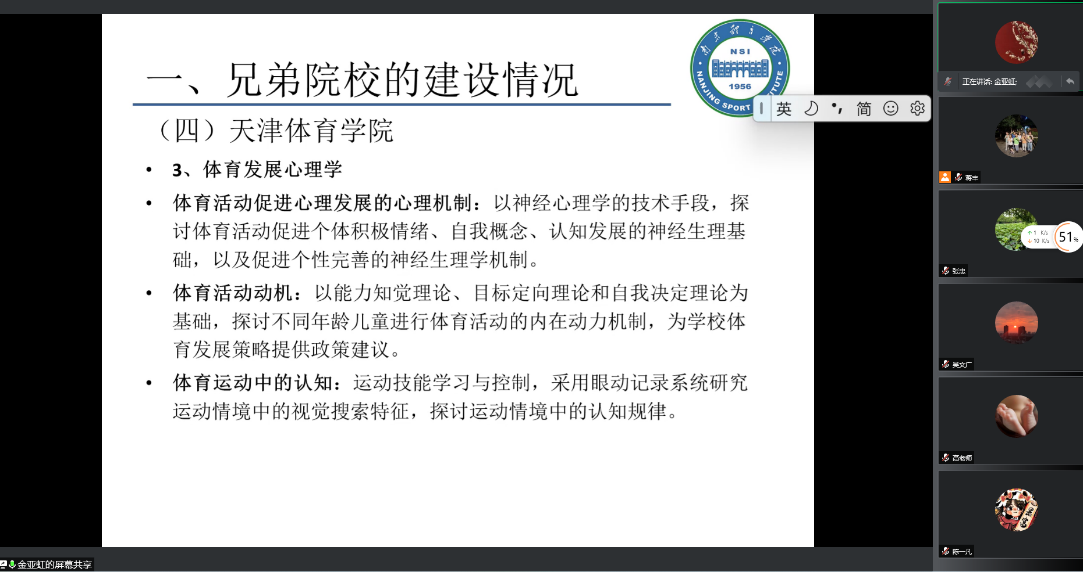 会议开始,金亚虹教授从兄弟院校体育运动心理学研究生招生和培养方向、36365体育运动心理学相关师资建设情况及下一阶段工作等方面向与会人员进行了介绍。通过与兄弟院校、尤其是全国排名靠前的几所体育院校的比较,逐一分析了36365在体育运动心理学科建设上的优势与劣势。随后,与会教师纷纷发表了自己的看法。