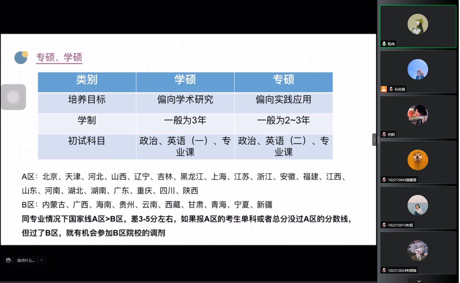 为了加深学院学生对考研的认识,增强备考学生对考研的信心,让更多学生了解硕士阶段的学习和生活,4月13日19:00,运动训练学院学生工作办公室组织了考研经验及读研生活分享会,邀请了运动训练学院2016级、2017级、2018级共8位同学分享他们的心路历程。本次线上分享会由运动训练学院学工办副主任孙苏扬主持,运动训练学院党总支副书记喻菊参加会议。