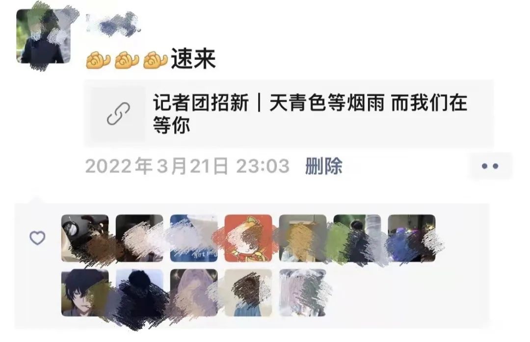 3月21日,记者团发布招新公告《记者团招新|天青色等烟雨而我们在等你》,介绍了记者团的基本情况和本次招新的要求。在随后的几天里,记者团收到了来自各学院的几十位同学提交的报名表。