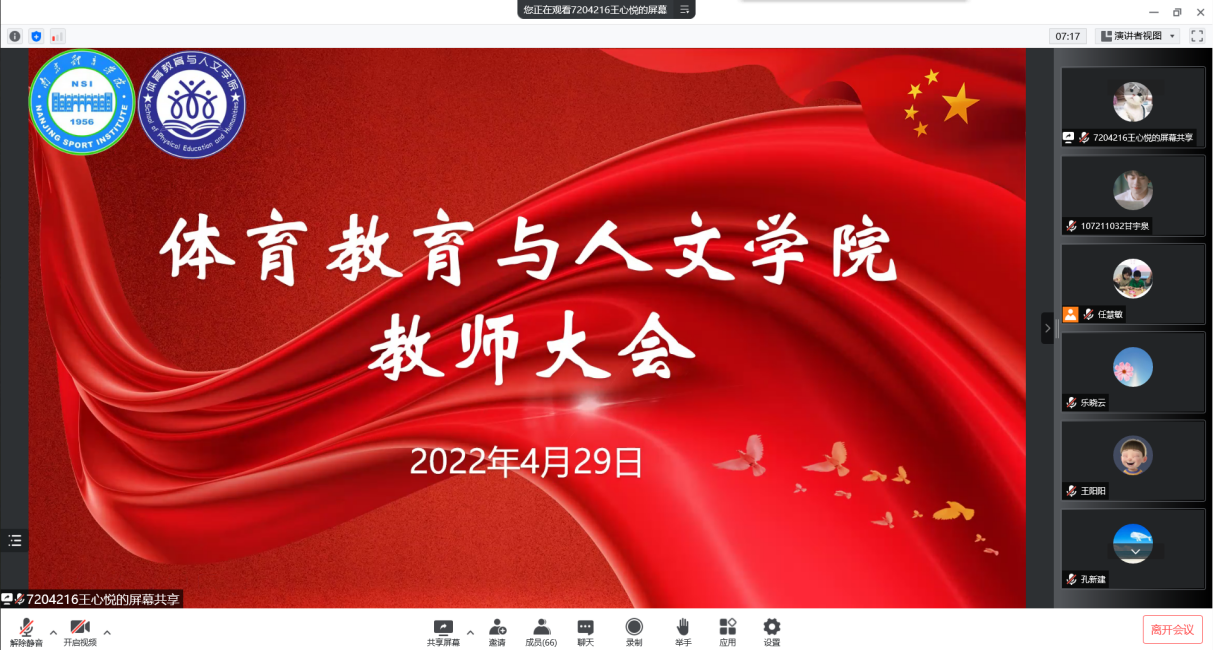 4月29日,体育教育与人文学院召开线上全院教师大会,传达学习、深入贯彻落实上级领导部门、学校关于疫情防控工作的最新会议精神及文件要求。体育教育与人文学院党总支书记邹国忠出席会议并讲话,副院长(主持工作)王凯主持会议。体育教育与人文学院全体教师参会。