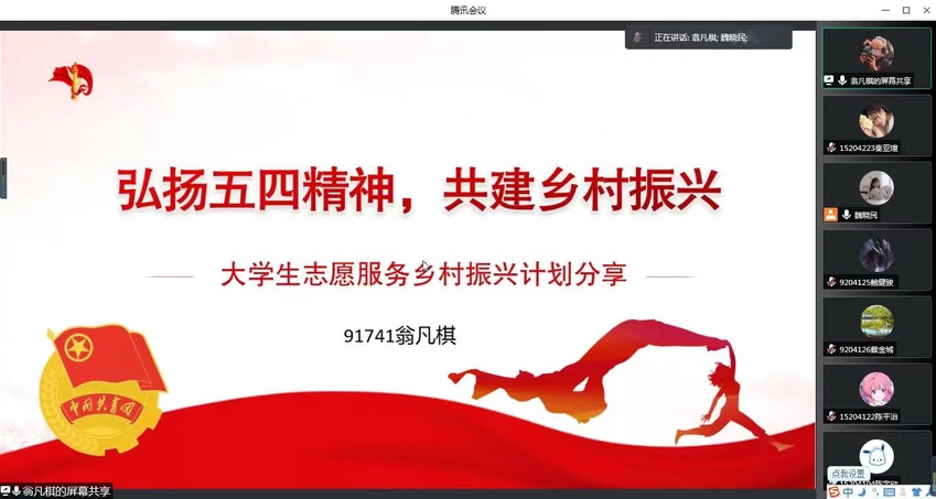 5月4日晚,运动健康学院团委通过腾讯会议平台,邀请2021届运动康复专业毕业生翁凡棋主讲“弘扬五四精神 共筑乡村振兴”梦想公开课,分享其在苏北志愿服务过程中的收获与成长,介绍“大学生志愿服务乡村振兴计划”,动员大家扎根基层,在奋斗中书写青春,增强青年学生的社会责任感和历史使命感,深入了解国情、社情、民情,树立正确就业观,锤炼过硬本领。