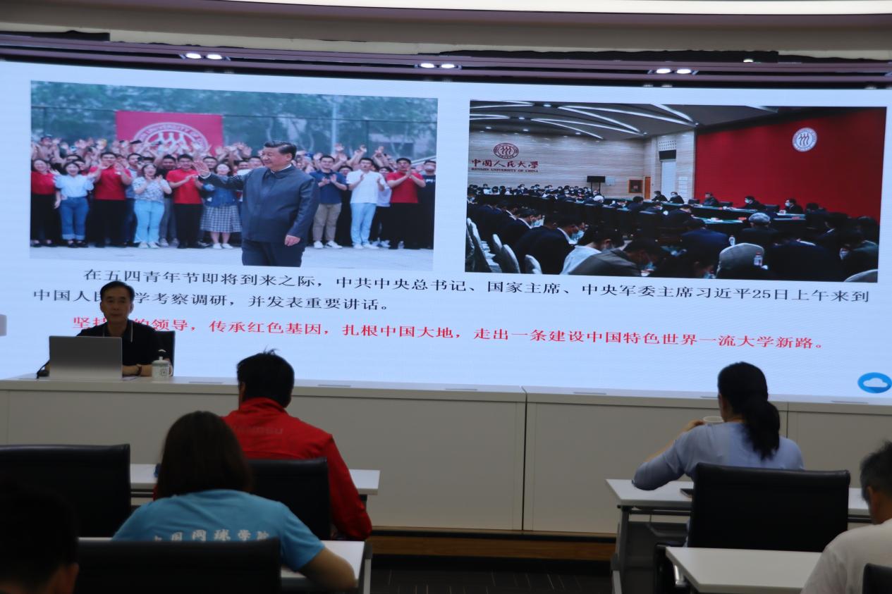会上,丁习明对习近平总书记在中国人民大学考察时的重要讲话内容进行了领学。在五四青年节即将到来之际,中共中央总书记、国家主席、中央军委主席习近平4月25日上午来到中国人民大学考察调研时强调,“为谁培养人、培养什么人、怎样培养人”始终是教育的根本问题,要坚持党的领导,坚持马克思主义指导地位,坚持为党和人民事业服务,落实立德树人根本任务,传承红色基因,扎根中国大地办大学,走出一条建设中国特色、世界一流大学的新路。广大青年要做社会主义核心价值观的坚定信仰者、积极传播者、模范践行者,向英雄学习、向前辈学习、向榜样学习,争做堪当民族复兴重任的时代新人,在实现中华民族伟大复兴的时代洪流中踔厉奋发、勇毅前进。习近平总书记指出,好的学校特色各不相同,但有一个共同特点,都有一支优秀教师队伍。对教师来说,想把学生培养成什么样的人,自己首先就应该成为什么样的人。培养社会主义建设者和接班人,迫切需要我们的教师既精通专业知识、做好“经师”,又涵养德行、成为“人师”,努力做精于“传道授业解惑”的“经师”和“人师”的统一者。