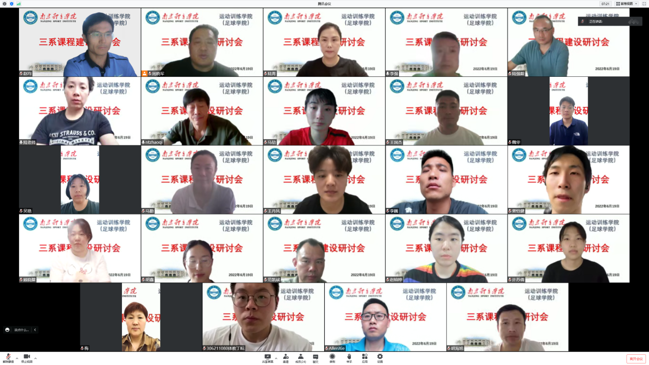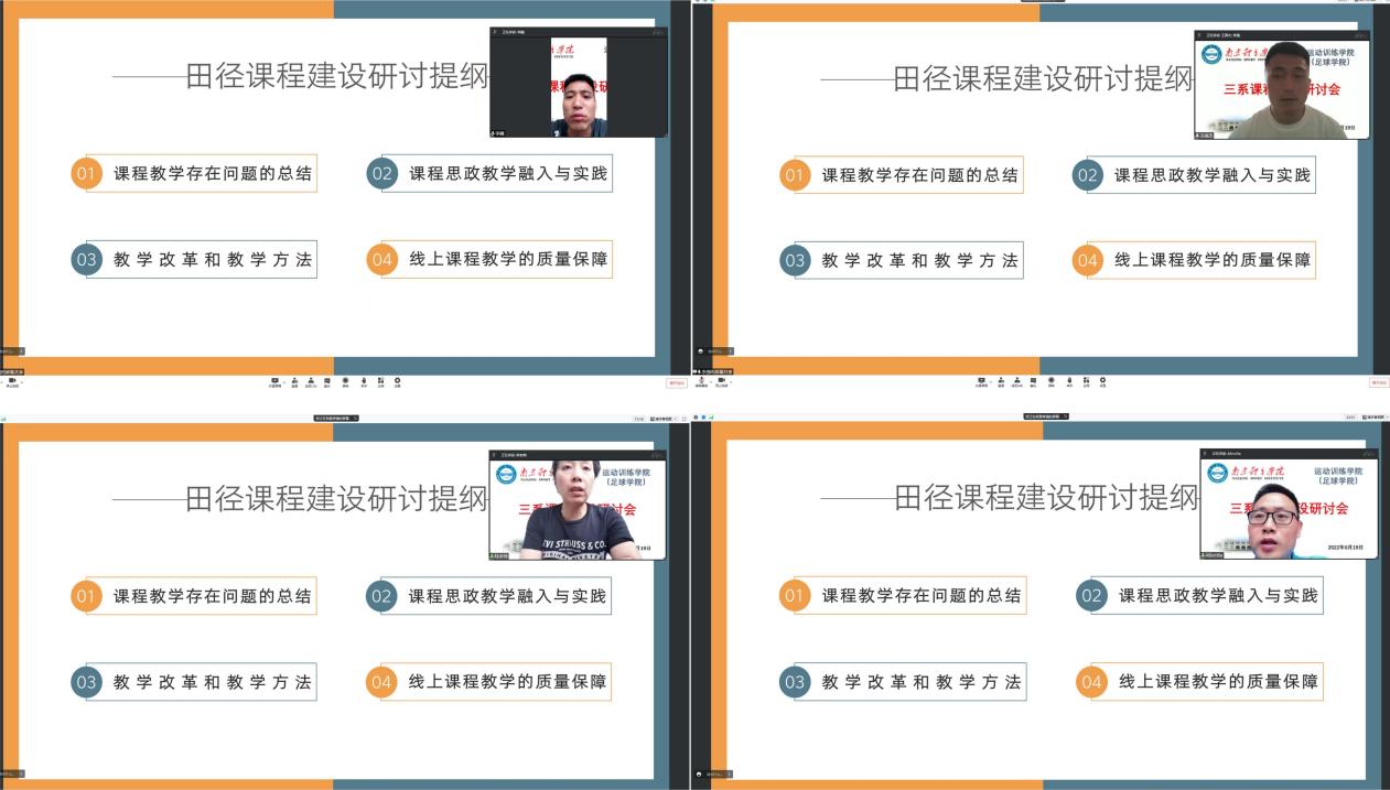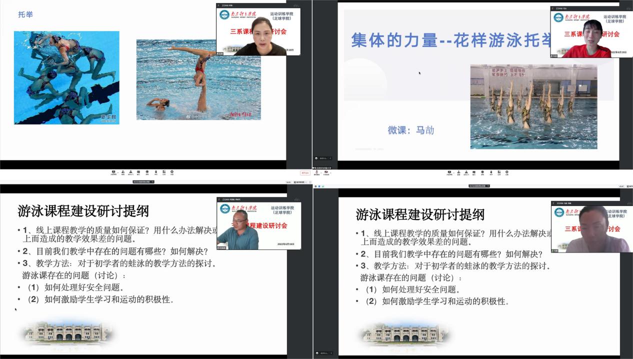 随后,陆青和李强分别主持游泳和田径课程建设的专题研讨,分别讨论了田径和游泳课程的基本情况、存在的主要问题与课程发展思路。接着范凯斌博士分享了《器械健身指导》课程思政团队建设经验,胡鑫博士分享了《儿童体适能》微课制作设想。