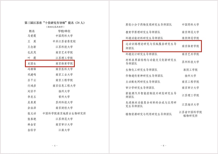 近日,由江苏省学位与研究生教育学会、江苏省教育厅教育宣传中心(江苏教育报刊总社)联合开展的第三届江苏省“十佳研究生导师”和“十佳研究生导师团队”评选结果公布,根据《关于公布第三届江苏省“十佳研究生导师”和“十佳研究生导师团队”推选结果的通知》,校党委副书记、校长杨国庆研究员带领的“运动训练理论研究与实践服务研究生导师团队”获得省“十佳研究生导师团队”提名,校党委副书记、副校长史国生教授获得省“十佳研究生导师”提名。