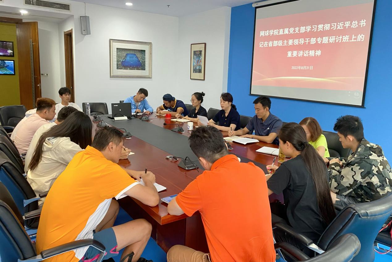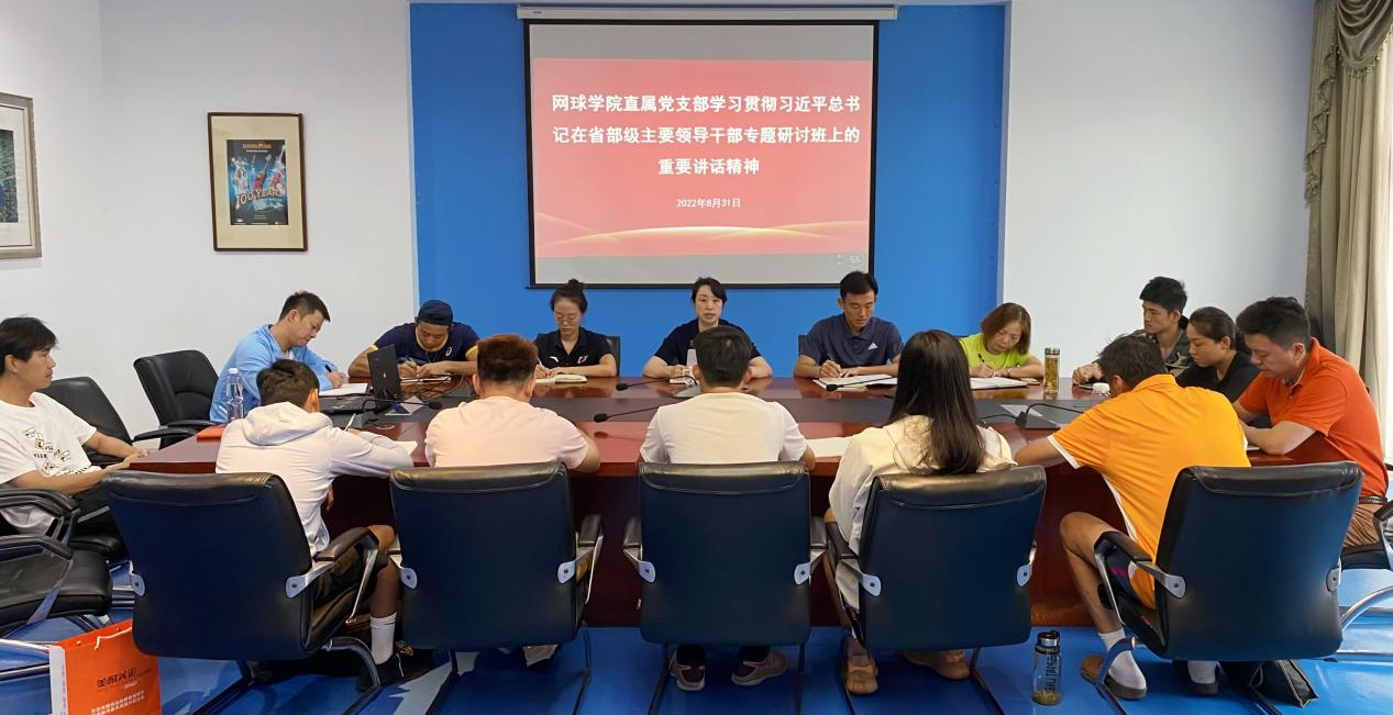 8月31日上午,网球学院直属党支部召开全体党员会议暨理论学习中心组扩大会议,深入学习领会习近平总书记在省部级主要领导干部“学习习近平总书记重要讲话精神,迎接党的二十大”专题研讨班上的重要讲话精神,部署网球学院贯彻落实工作。网球学院全体党员、预备党员参加会议,会议由网球学院直属党支部副书记、院长鲍勤主持。