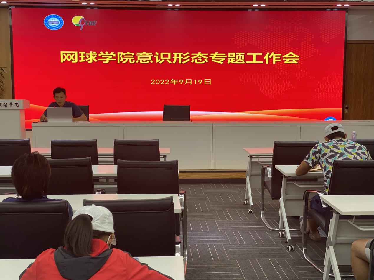 9月19日,网球学院直属党支部召开意识形态专题工作会,传达学习上级关于意识形态工作的相关文件精神,布置本学院意识形态工作安排,网球学院全体管理干部、教练员及南京钟山网球发展有限公司全体职工参加会议。会议由网球学院办公室主任韩燕成主持。