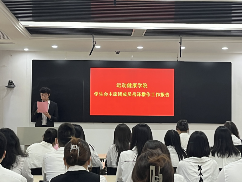 运动健康学院第二届主席团成员岳泽楷向大会作了题为《喜迎二十大 砥砺再出发 以青春之我谱写新时代的奋进之歌》学生会工作报告。大会审议并通过了学生会工作报告决议、提案工作报告决议、学生会章程(草案),选举产生了运动健康学院第三届学生委员会委员、运动健康学院第三届学生会主席团成员。
