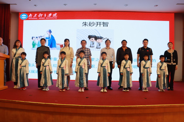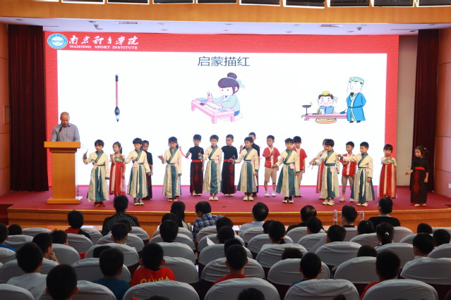 在入学仪式上,8位二年级新生身着汉服,在吴丽老师的带领下,依次完成正衣冠、朱砂点痣、启蒙描红、诵读《弟子规》等四项仪式,寓意新同学们传承中华传统文化,树立为新时代中国体育建功立业的理想,成为正衣冠、正言行、正心信、正学业的四正少年。