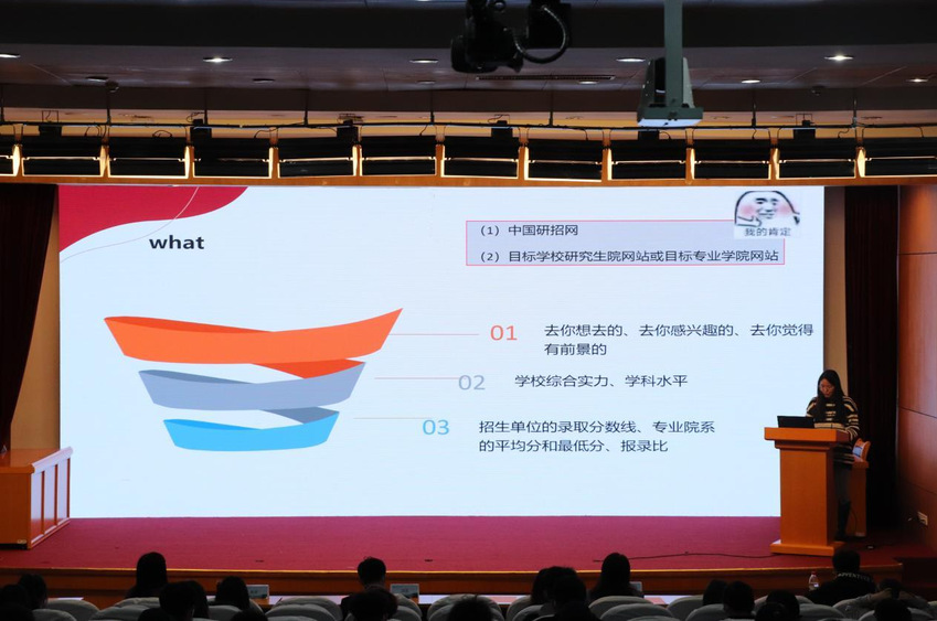 运动人体科学专业的胡慧同学和运动康复专业的程燕翔同学分别进行了学习经验的分享。两位同学表示:有目标、有自信、有动力是保证学习成绩的必要条件。胡慧同学对大二、大三学生的未来规划提出建议。程燕翔同学则从培养的良好习惯入手,讲解研究生推免的流程,分享课堂笔记的记录经验等。