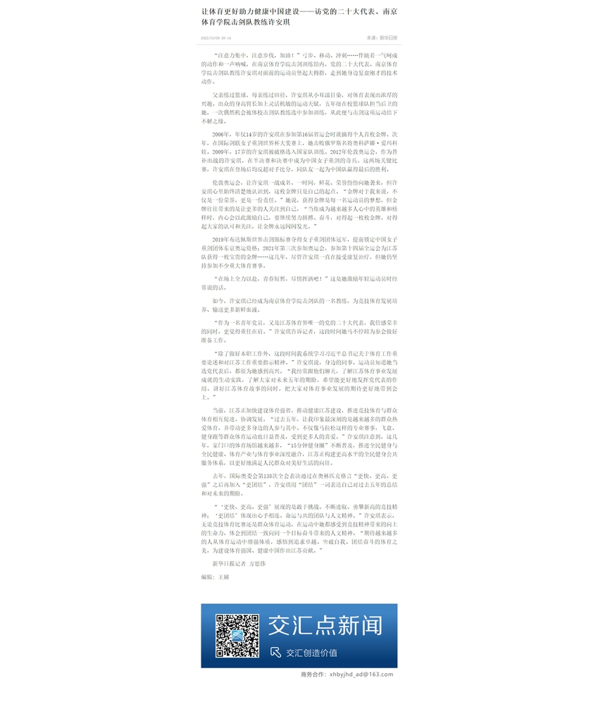 新华日报《让体育更好助力健康中国建设——访党的二十大代表、36365最新线路检测中心击剑队教练许安琪》