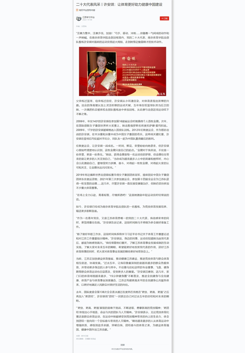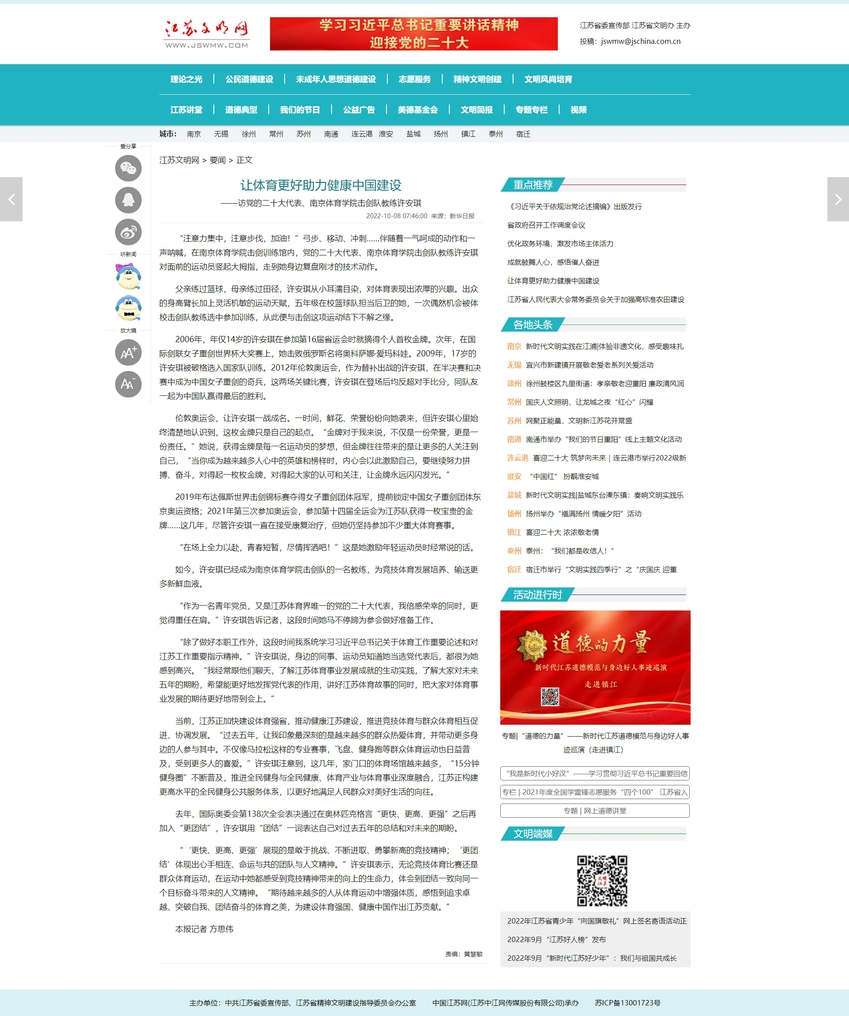 江苏文明网《让体育更好助力健康中国建设——访党的二十大代表、36365最新线路检测中心击剑队教练许安琪》