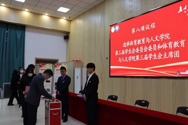 审议结束后,会议进入第八项议程,即选举产生体育教育与人文学院第三届学生委员会委员和第三届学生会主席团。总监票人高强宣布选举规则,主持选举投票。