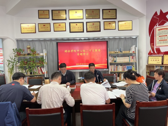 10月21日下午,游泳学院召开党总支理论学习中心组扩大会议,认真学习习近平总书记在中国共产党第二十次全国代表大会开幕会上的讲话精神。游泳学院全体管理干部参加了会议,会议由游泳学院党总支书记、院长王伟新主持。