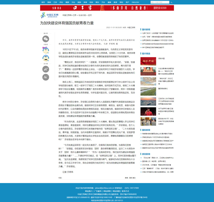 【中国江苏网】为建设体育强国贡献青春力量 二十大代表许安琪走进思政课堂宣讲党的二十大精神